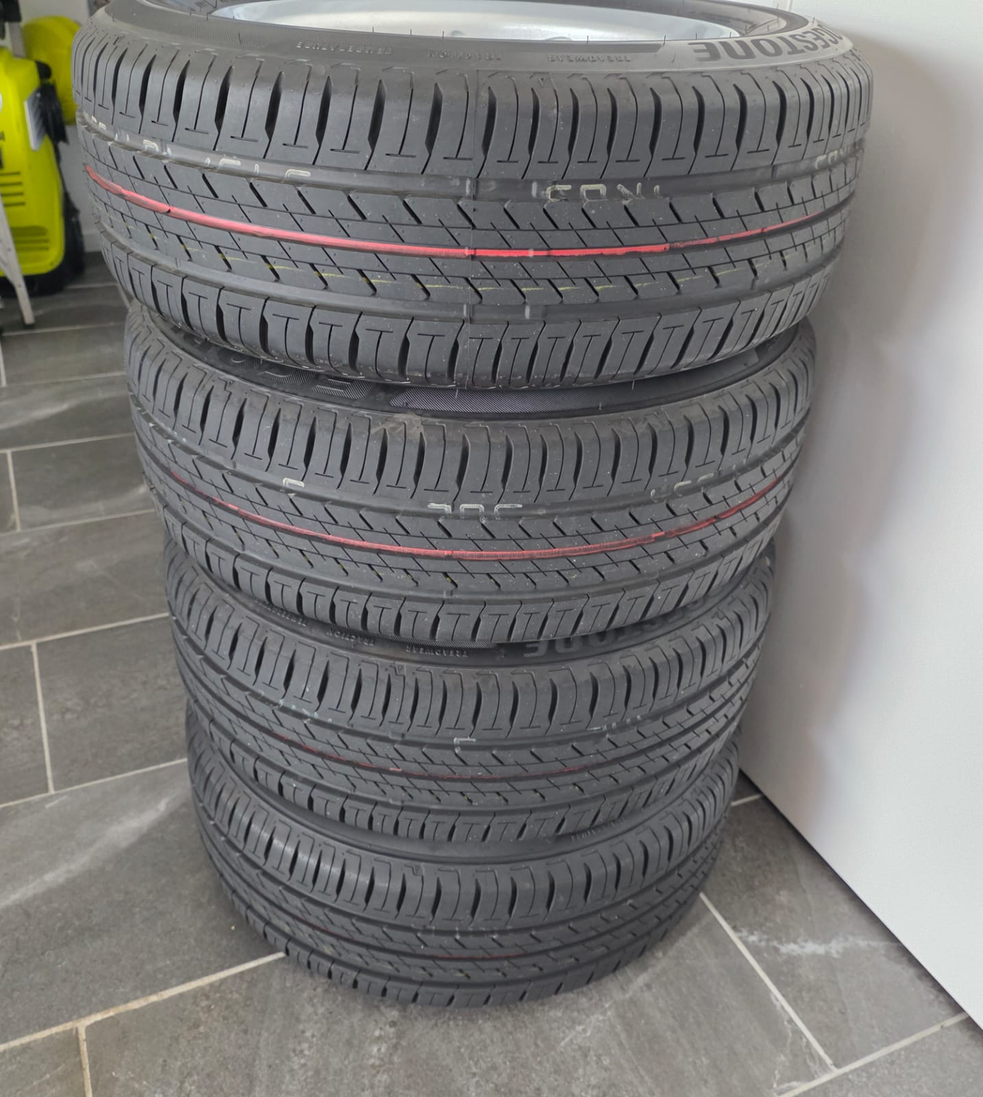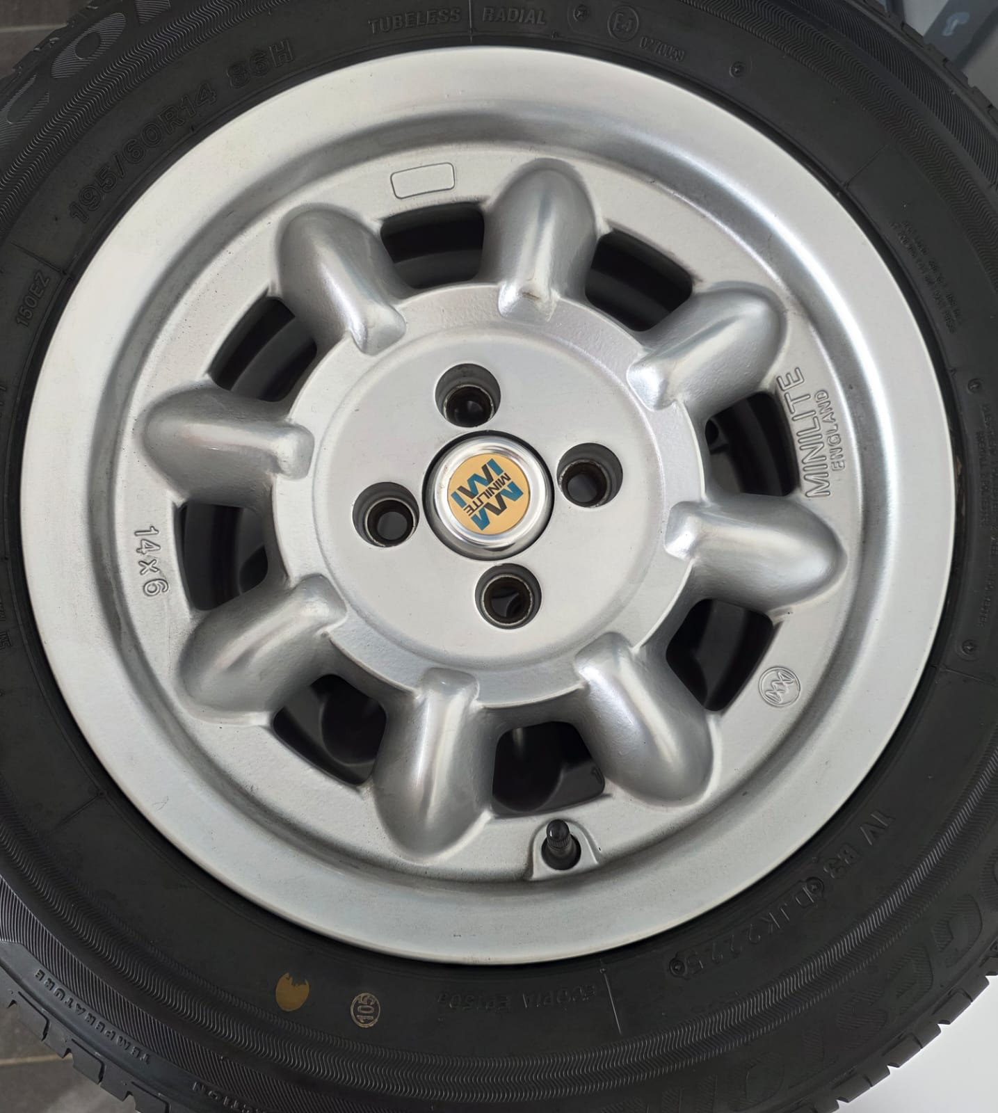 A set of 4 Minilite Alloy wheels14 x 6” (PCD 4 x 95.35mm) for sale (Real Minilite's, NOT copies), with brand new Bridgestone tyres, which will suit most BL cars.